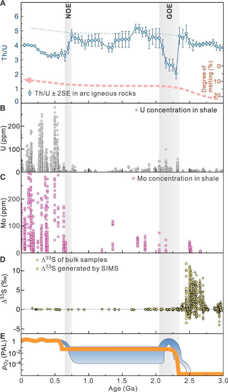 Liu H., Zartman R. E., Ireland T. R., Sun W.-D. 2019. Global atmospheric oxygen variations recorded by Th/U systematics of igneous rocks. Proceedings of the National Academy of Sciences of the United States of America. DOI: 10.1073/pnas.1902833116.