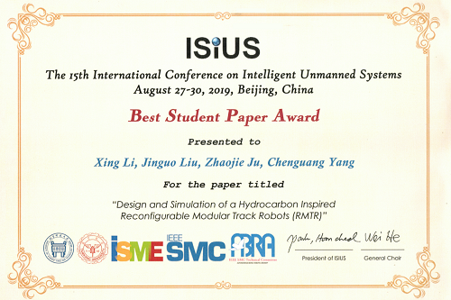 沈陽(yáng)自動(dòng)化所空間自動(dòng)化技術(shù)研究室博士生李興在導(dǎo)師劉金國(guó)研究員的指導(dǎo)下,主要從事新型變構(gòu)型機(jī)器人的研究工作。該論文以新概念無(wú)人平臺(tái)為背景,設(shè)計(jì)了基于仿生可重構(gòu)原理的履帶式模塊機(jī)器人,理論分析了該機(jī)器人系統(tǒng)的構(gòu)型多樣性和環(huán)境適應(yīng)性,并進(jìn)行了仿真研究。會(huì)議期間,李興在會(huì)上作報(bào)告介紹了論文的最新工作進(jìn)展,獲得會(huì)議組委會(huì)的一致好評(píng),最終榮獲“最佳學(xué)生論文獎(jiǎng)”。該研究得到了國(guó)家重點(diǎn)研發(fā)計(jì)劃(基金號(hào):2018YFB1304600)、國(guó)家自然科學(xué)基金(基金號(hào): 51775541)和中國(guó)科學(xué)院交叉創(chuàng)新團(tuán)隊(duì)(基金號(hào):JCTD-2018-11)的資助。