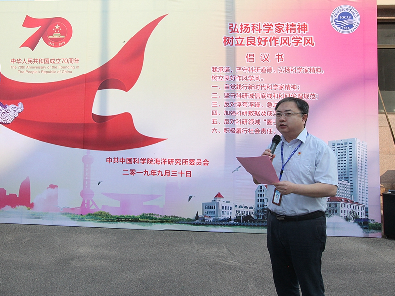 為慶祝新中國(guó)成立70周年,弘揚(yáng)愛國(guó)主義精神,9月30日,海洋所隆重舉行慶祝新中國(guó)成立70周年升國(guó)旗儀式。中科院黨組駐海洋所巡視組成員、沈陽分院分黨組書記姬蘭柱以及海洋所全體職工和研究生參加升旗儀式,海洋所黨委書記王輝主持儀式。