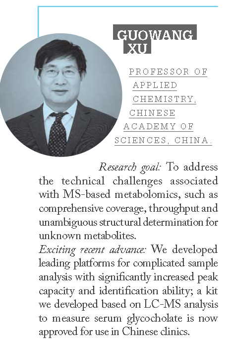 近五年來,許國(guó)旺帶領(lǐng)團(tuán)隊(duì)在代謝組學(xué)等復(fù)雜體系分離分析研究方面取得了多項(xiàng)創(chuàng)新性研究成果:研發(fā)了適用于精準(zhǔn)醫(yī)學(xué)研究的超靈敏、高覆蓋的代謝組學(xué)定量、定性綜合技術(shù)體系,構(gòu)建了國(guó)際先進(jìn)的代謝組學(xué)分析平臺(tái);建立了一系列高靈敏、高覆蓋的新型多維色譜-質(zhì)譜分析方法;國(guó)際上首創(chuàng)擬靶向代謝組學(xué)新策略,實(shí)現(xiàn)了大規(guī)模臨床樣本代謝組高覆蓋精準(zhǔn)的分析;自主構(gòu)建的國(guó)內(nèi)最大的LC-MSn代謝組智能數(shù)據(jù)庫(kù),為代謝物規(guī)?;Y(jié)構(gòu)鑒定和臨床標(biāo)志物發(fā)現(xiàn)提供了新工具。這些分析技術(shù)和方法已經(jīng)應(yīng)用于生命科學(xué)、醫(yī)學(xué)、食品安全等領(lǐng)域重大科學(xué)問題的研究,為至少50個(gè)醫(yī)院提供代謝組學(xué)分析服務(wù),同時(shí)為國(guó)內(nèi)代謝組學(xué)學(xué)科發(fā)展作出貢獻(xiàn)。