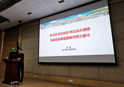 首先,王華作了題為《學習總書記講話,樹立遠大理想,為建設(shè)創(chuàng)新型國家而努力奮斗》的報告。報告從多個方面論證和闡述了創(chuàng)新對于科技發(fā)展、社會進步、國家強盛的重要性,并向同學們傳達了習近平總書記在黨的十九大、全國教育大會、紀念五四運動100周年大會上的一系列重要精神講話。他引導同學們志存高遠、腳踏實地,從實際出發(fā),從身邊事做起,將國家未來的發(fā)展和需要時刻牢記心中,向老一輩科學家學習科技報國、愛國奉獻的精神,并響應習總書記的號召,樹立遠大理想,熱愛偉大祖國,擔當時代責任,勇于砥礪奮斗,練就過硬本領(lǐng),并且不斷錘煉品德修為,為中國特色社會主義建設(shè),實現(xiàn)中華民族的偉大復興而不斷努力和奮斗。