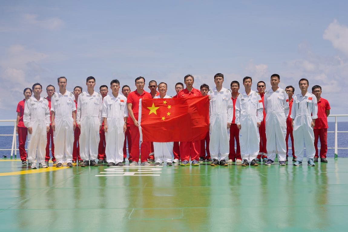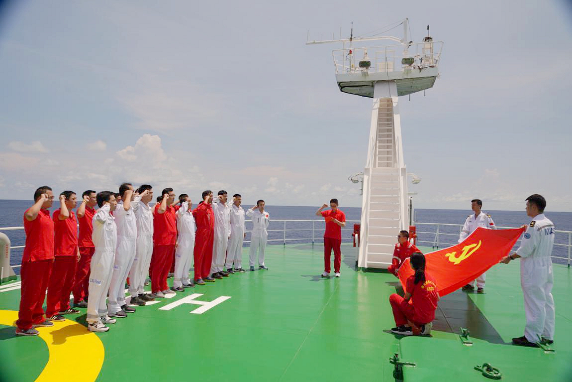 11時40分,西太平洋海面波光粼粼,晴空萬里?!翱茖W(xué)”號海上堡壘臨時黨支部全體黨員、入黨積極分子列隊整齊,迎接穿越赤道的莊嚴(yán)時刻。全體人員在五星紅旗前齊唱國歌,在雄壯的歌聲中“科學(xué)”號跨越赤道線進入南半球。隨后,全體黨員在航次科考隊長賈凡領(lǐng)讀下重溫入黨誓詞,嘹亮的誓言、真摯的情感讓現(xiàn)場所有人都深受感染,更加堅定了作為一名共產(chǎn)黨員踐行誓言、終生不渝的初心信念。