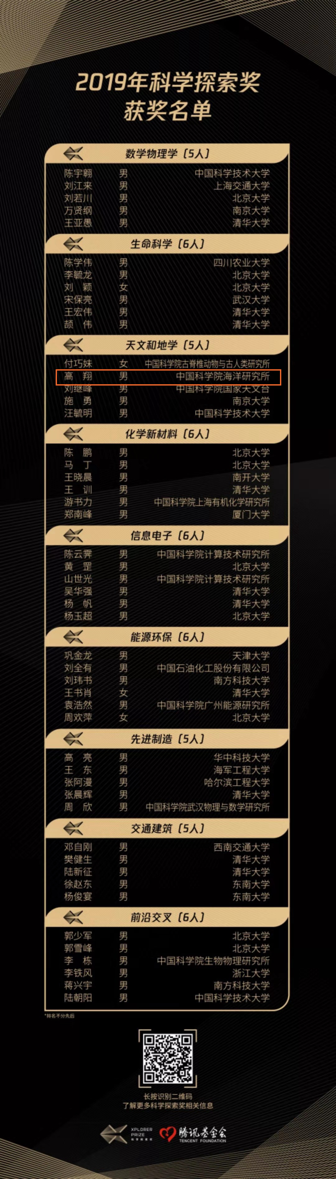 11月2日,由騰訊基金會等發(fā)起的首屆“科學(xué)探索獎”頒獎典領(lǐng)在北京舉行,來自全國11個省市的26個科研單位、高校和企業(yè)共50位科技工作者獲獎,中科院海洋所高翔研究員入選領(lǐng)域為“天文和地學(xué)”領(lǐng)域。