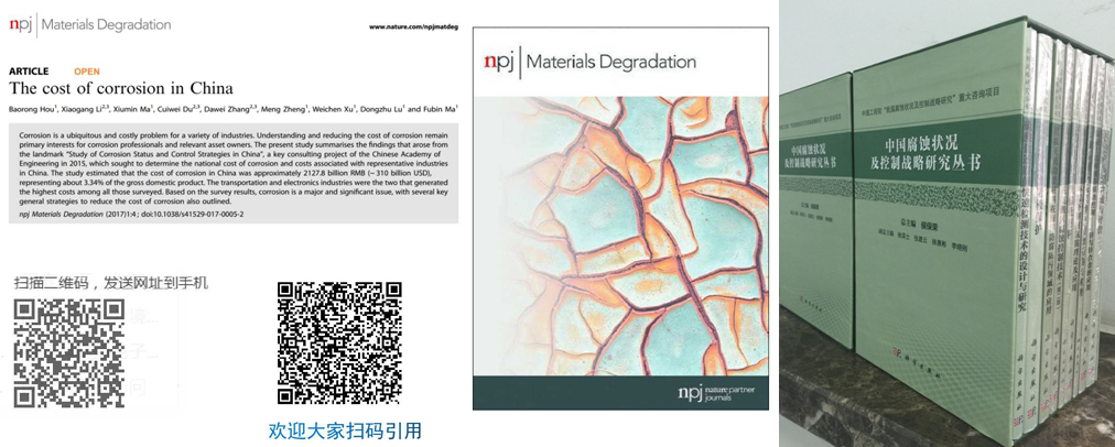 此外,關于中國腐蝕成本的研究成果和相關論文以“The cost of corrosion in China”為題發(fā)表在Nature子刊《npj Materials Degradation》(B. Hou, et al. 2017, 1, Article number 4). 同時,在本項目完成結題時,以徐匡迪院士、丁仲禮院士、周濟院士為顧問,侯保榮院士為總主編,出版腐蝕相關專著共計32部,并已由科學出版社正式出版發(fā)行。
