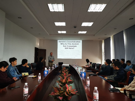 Drake首先做了題為“Darwin’s Invertebrates: Why Is This Primitive Gut Ecosystem Still Here?”的學(xué)術(shù)報(bào)告,詳細(xì)介紹了他40年以來(lái)對(duì)生物與環(huán)境相互作用關(guān)系的理解,重點(diǎn)介紹了蚯蚓腸道如何作為暫時(shí)的微生物生存綠洲,提供豐富的碳源;如何對(duì)不同種類(lèi)的微生物進(jìn)行選擇性的富集,改變土壤中微生物多樣性和結(jié)構(gòu)的過(guò)程,并對(duì)整個(gè)過(guò)程中的反硝化作用、甲烷合成作用、發(fā)酵過(guò)程以及溫室氣體生成機(jī)理進(jìn)行了詳細(xì)的闡述。隨后,Drake根據(jù)多年擔(dān)任AEM期刊主編的審稿經(jīng)驗(yàn),做了題為“The Art of Scientific Publishing”的報(bào)告,特別指出科研工作者要具備應(yīng)有的學(xué)術(shù)道德,耐心講述論文寫(xiě)作中應(yīng)該注意的問(wèn)題,詳細(xì)指導(dǎo)如何將選擇題目、編寫(xiě)摘要,如何將獲得的實(shí)驗(yàn)數(shù)據(jù)和結(jié)果總結(jié)為精彩的論文并成功發(fā)表。