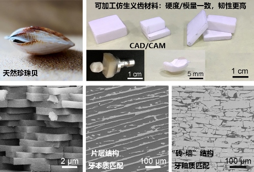 圖1:新型仿生復(fù)合義齒材料的宏觀外形、微觀組織結(jié)構(gòu)及其與天然貝殼的比較