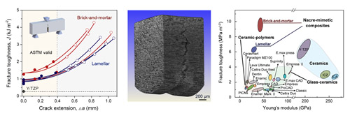 近期,中國(guó)科學(xué)院金屬研究所材料疲勞與斷裂實(shí)驗(yàn)室劉增乾研究員和張哲峰研究員與美國(guó)加州大學(xué)伯克利分校的Robert O. Ritchie教授以及吉林大學(xué)開展合作,他們結(jié)合生物力學(xué)原理,采取組成復(fù)合化和組織結(jié)構(gòu)仿生化設(shè)計(jì),將臨床應(yīng)用的氧化鋯陶瓷與生物相容性樹脂相結(jié)合,通過模仿天然貝殼珍珠層的微觀組織結(jié)構(gòu),設(shè)計(jì)研發(fā)了硬度、強(qiáng)度和模量均與人體正常牙齒(包括牙釉質(zhì)和牙本質(zhì))完全匹配的新型氧化鋯-樹脂仿生復(fù)合義齒材料。新型義齒材料微觀上具有與天然貝殼類似的組織結(jié)構(gòu),氧化鋯以片層形式平行排列或以“磚墻”形式緊密堆疊,其間的空隙以樹脂填充,如圖1所示。同時(shí),他們提出了能夠準(zhǔn)確描述并預(yù)測(cè)仿生材料模量的力學(xué)模型,并且通過調(diào)控材料的微、納米尺度組織結(jié)構(gòu),實(shí)現(xiàn)了新型義齒材料的硬度、強(qiáng)度和模量與人體正常牙齒的完全匹配。