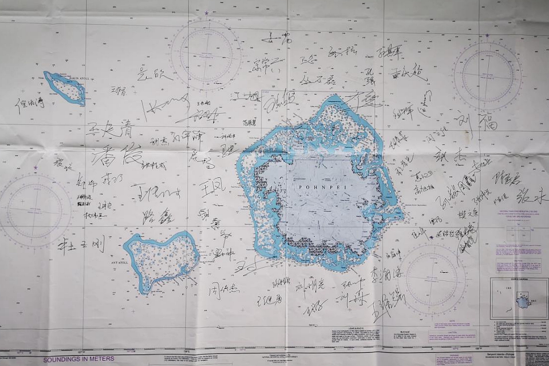 經(jīng)過四十多天的并肩奮斗,來自不同單位的科考人員從陌生到熟悉,結(jié)下了深厚的友誼。部分科考隊員已經(jīng)完成航次任務,將在靠港波納佩后返程回國。在“科學”號“海上堡壘”臨時黨支部書記杜玉剛同志提議下,全體船隊員在一張舊海圖上簽下自己的名字,把這段難忘的出海經(jīng)歷及深厚友誼定格在海圖上。