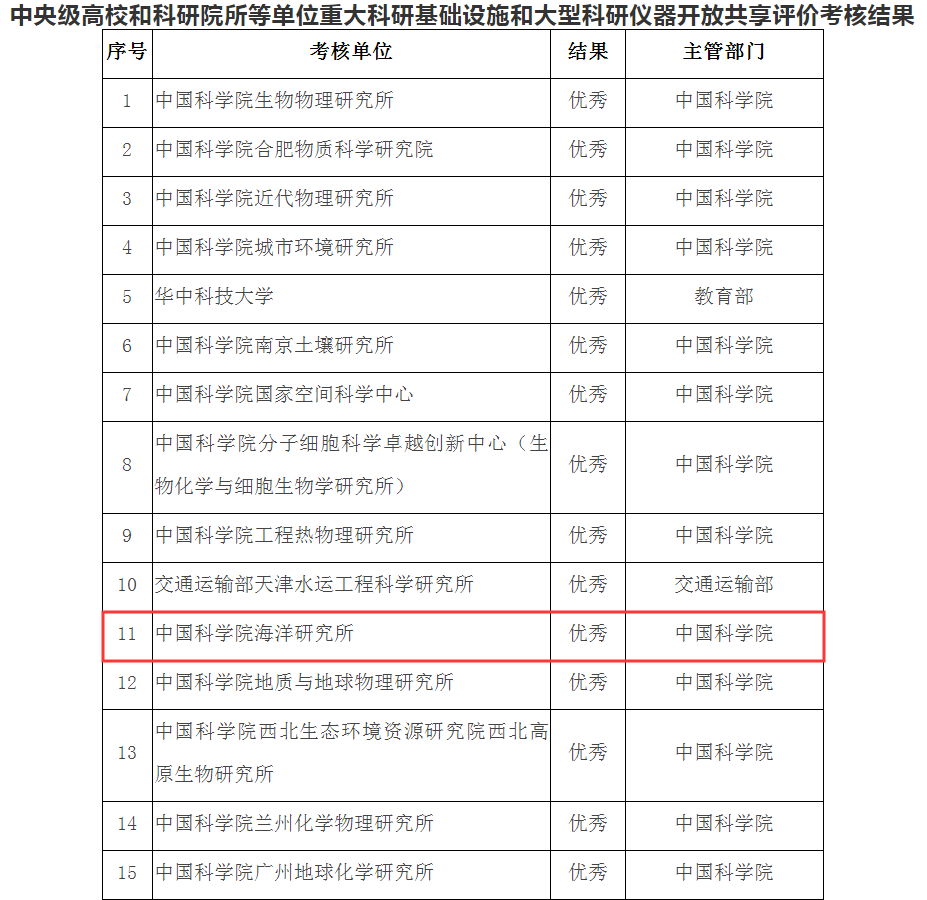 11月19日,科技部辦公廳和財政部辦公廳聯(lián)合發(fā)布2019年中央級高校和科研院所等單位重大科研基礎(chǔ)設(shè)施和大型科研儀器開放共享評價考核結(jié)果。本次考核共有25個部門344家單位參加評價考核,中科院海洋所因管理制度規(guī)范,科研儀器設(shè)備運行使用效率高,對外開放共享成效明顯,在52個獲評優(yōu)秀單位中列第11名。這是海洋所連續(xù)二年在中央級大型儀器開放共享評價考核中獲評優(yōu)秀。