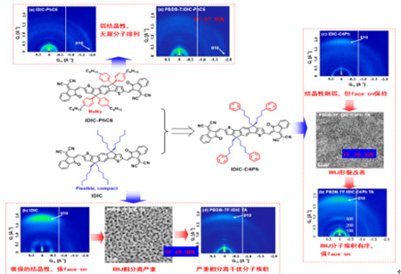 有機(jī)光伏電池由于具有柔性、質(zhì)輕、可潛在大規(guī)模印刷制備等諸多優(yōu)點(diǎn)而受到廣泛關(guān)注。該類(lèi)器件的吸光層的形貌對(duì)器件的光電轉(zhuǎn)換性能和器件工藝難易度有重要的影響。從分子設(shè)計(jì)角度,發(fā)展新型高效材料和加深對(duì)材料聚集特性的認(rèn)知,提升器件光電轉(zhuǎn)換性能的同時(shí)發(fā)展易形貌調(diào)控的器件工藝,對(duì)發(fā)展大規(guī)模印刷工藝以及快速推動(dòng)有機(jī)光伏的應(yīng)用具有重要的意義。