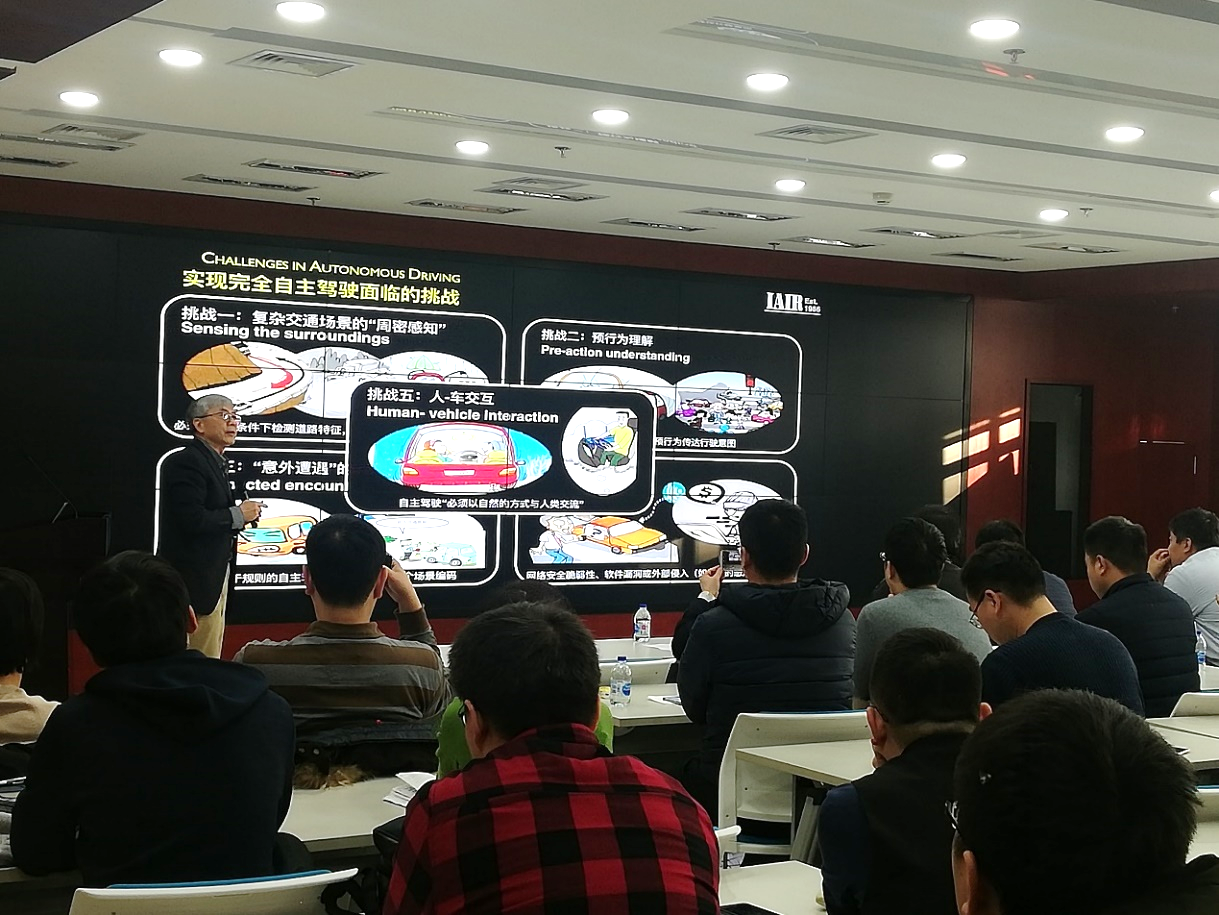 在科研工作方面,作為我國率先開展無人駕駛及輔助安全駕駛的研究團(tuán)隊之一,鄭南寧介紹了目前無人駕駛的研究現(xiàn)狀,深入分析了無人駕駛汽車要適應(yīng)復(fù)雜的交通環(huán)境仍面臨的五大挑戰(zhàn)。他分享展示了團(tuán)隊研發(fā)的無人駕駛汽車在中國智能車挑戰(zhàn)賽上的精彩表現(xiàn),其在城鄉(xiāng)道路、高架快速道路以及高架快速道路的真實交通流狀態(tài)下的匯入車流和動態(tài)超車等復(fù)雜路況下能夠平穩(wěn)駕駛。