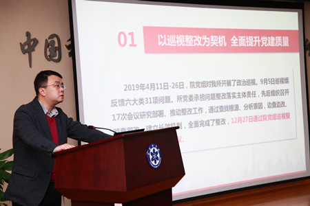 黨委書記、副所長(zhǎng)彭輝從以巡視整改為契機(jī) 全面提升黨建質(zhì)量,開展“不忘初心、牢記使命”主題教育兩個(gè)大方面向大會(huì)匯報(bào)了2019年度研究所黨的建設(shè)工作情況。他指出,2019年,在院黨組統(tǒng)一領(lǐng)導(dǎo)下,在分院分黨組指導(dǎo)與支持下,在所黨委委員和所班子的支持與共同努力下,研究所黨委深入學(xué)習(xí)習(xí)近平新時(shí)代中國(guó)特色社會(huì)主義思想和黨的十九大、十九屆二中、三中、四中全會(huì)精神,貫徹落實(shí)上級(jí)黨組織工作部署要求,深入開展“不忘初心、牢記使命”主題教育,全面整改落實(shí)院黨組政治巡視反饋問題,推進(jìn)黨的建設(shè)全面發(fā)展,切實(shí)發(fā)揮黨委戰(zhàn)斗堡壘作用,為研究所創(chuàng)新發(fā)展提供堅(jiān)強(qiáng)保障。