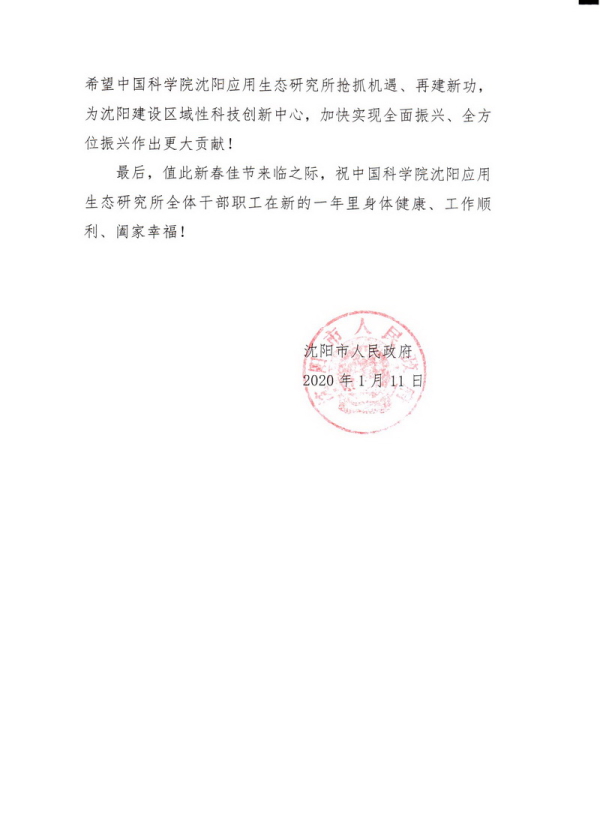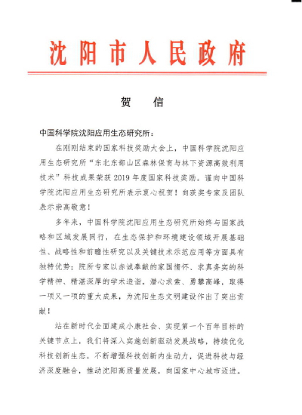 2020年1月11日,沈陽市人民政府發(fā)來賀信,向沈陽生態(tài)所榮獲2019年度國家科技進步二等獎表示衷心祝賀,向獲獎專家級團隊表示崇高敬意,對研究所為沈陽生態(tài)文明建設作出的貢獻予以肯定,并希望研究所搶抓機遇,再建新功,為沈陽建設區(qū)域性科技創(chuàng)新中心,實現(xiàn)全面振興作出更大貢獻。
