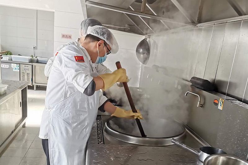 科學(xué)防疫,重在防范。正式開工前,海洋所對(duì)食堂工作人員及家屬的健康狀況進(jìn)行了深入摸底,要求外地返青人員在家進(jìn)行自我隔離,并對(duì)食堂進(jìn)行了徹底消毒,以保證食堂作業(yè)的環(huán)境衛(wèi)生和人員健康。疫情防控期間,食堂工作人員的“規(guī)范操作流程”又多了好多條規(guī)矩:每天進(jìn)行體溫檢測(cè),工作過程中必須全程佩戴口罩,每日對(duì)食堂及周邊環(huán)境進(jìn)行清潔消毒并做好記錄,禁止采購活禽及不明來源食材,嚴(yán)格執(zhí)行烹飪食品的溫度和時(shí)間標(biāo)準(zhǔn)……徹底防范和切斷病毒的傳播途徑。