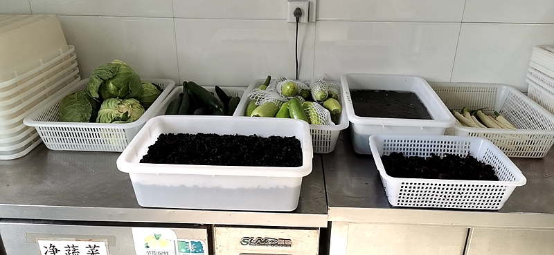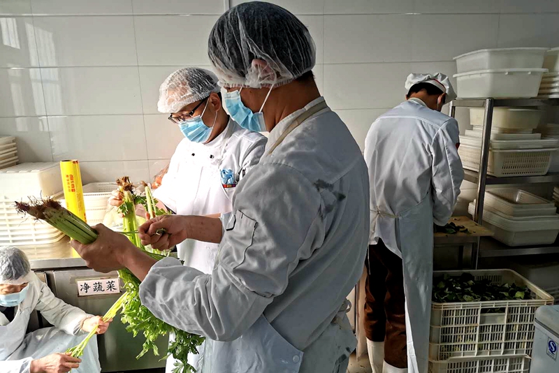 疫情期間,為防止人員聚集,研究所鼓勵輪值辦公和居家辦公,研究生也沒有開學(xué),因此每天就餐人數(shù)大概是平時的五分之一,南海路園區(qū)兩個食堂暫時關(guān)停了一個。今天食堂一共有12位工作人員到崗,大家統(tǒng)一穿著工作服,配帶口罩,擇菜、洗菜、切菜、和面……各司其職,分工合作,有序準(zhǔn)備著職工的午餐。