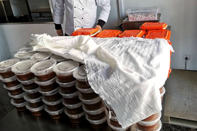 今天的供餐數(shù)量是160份,這對食堂工作人員也是一個不小的壓力。上午10點半,所有的菜品已準(zhǔn)備完畢,開始進行套餐的盒飯分裝。今天的套餐A是“皮五花肉燉土豆-尖椒燒茄子-蒜蓉油菜-米飯-饅頭”,套餐B是“炸刀魚-青椒炒肉片-西紅柿炒雞蛋-米飯-饅頭”,包子是芹菜肉包,湯是八寶粥,看上去非常誘人。分裝好的盒飯整齊地擺放在食堂大廳,用專用的罩布進行保溫,靜靜等待開飯時間。