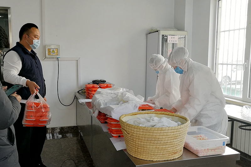 12點半,所有的訂餐已經(jīng)發(fā)放完畢,食堂工作人員開始午餐。大家非常自覺地分開就坐,不說話也不交流。吃完飯,大家開始對食堂大廳、桌椅以及后廚進行清掃消毒,并按照菜譜清點第二天所需食材。王保新把第二天的食譜上傳到所內(nèi)網(wǎng)辦公平臺及訂餐群,供職工選擇。大廚孫健一一清點后廚的生鮮儲備,列出了需要補充采購的目錄,并打電話向供應(yīng)商進行訂購。下午2點,食堂當(dāng)天的工作終于忙碌完畢,大家脫下工裝,陸續(xù)離去。