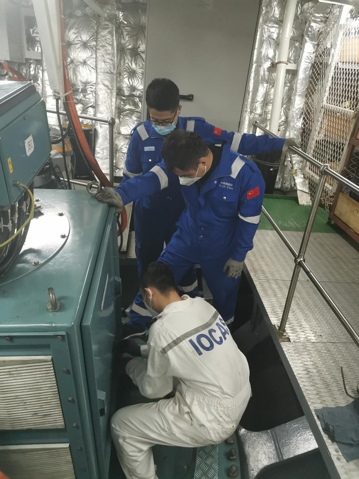 “機(jī)艙是船舶的心臟,防疫期間不能讓機(jī)艙設(shè)備掉鏈子”,“科學(xué)”號(hào)輪機(jī)長姜良優(yōu)說到。因?yàn)橐咔?,船舶設(shè)備商無法到船進(jìn)行設(shè)備維修,正常航修工程也無法進(jìn)行,為了最大程度保證維修進(jìn)度,姜良優(yōu)和他的同事們?nèi)翰呷毫Γ揽孔约旱膶I(yè)知識(shí)使正在進(jìn)行的維修工程順利收尾,并順利完成吊艙季度維護(hù)保養(yǎng)工作。