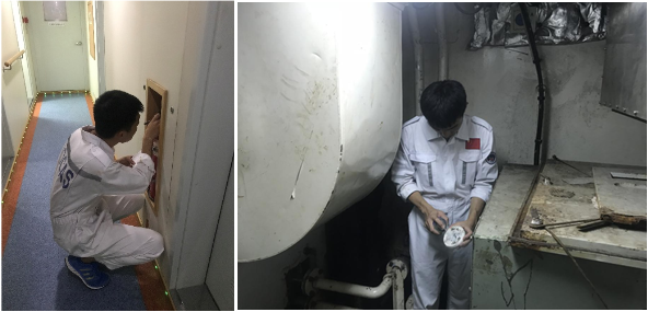 由于船舶的特殊構(gòu)造,房間窗戶要求水密不能打開,而且有些房間沒有窗戶。防疫期間,保持室內(nèi)通風(fēng)尤為重要,為了解決這一問題,輪機(jī)部每天對(duì)空調(diào)風(fēng)箱進(jìn)行清理、消毒,并把供風(fēng)模式改為新風(fēng),確??諝饬魍?。
