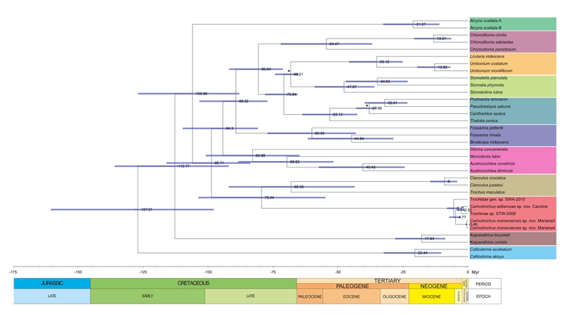 研究團(tuán)隊(duì)對(duì)海洋所歷次海山航次采集的腹足類標(biāo)本進(jìn)行整理分類時(shí)發(fā)現(xiàn)了這兩種形態(tài)特征獨(dú)特的馬蹄螺,標(biāo)本分別采自馬里亞納海山(水深865m)和卡羅琳海山(水深1332m)。研究發(fā)現(xiàn),兩者無(wú)論是在貝殼形態(tài)、齒舌特征以及軟體部分的解剖特征方面,均與已知的馬蹄螺科種類存在明顯差別。為進(jìn)一步確認(rèn)其分類地位,研究人員利用多基因聯(lián)合建樹(shù)的方法對(duì)馬蹄螺科進(jìn)行了系統(tǒng)發(fā)育分析。結(jié)果顯示,它們并沒(méi)有與馬蹄螺科中任何已知的亞科聚在一起,而是單獨(dú)聚成一支?;谏鲜鲅芯?,將這兩種馬蹄螺分別命名為馬里肋馬蹄螺Carinotrochus marianaensis Zhang S.Q., Zhang J.L. & Zhang S.P., 2020和威氏肋馬蹄螺Carinotrochus williamsae Zhang S.Q., Zhang J.L. & Zhang S.P., 2020,并為此建立了1個(gè)新亞科肋馬蹄螺亞科Carinotrochinae及1新屬肋馬蹄螺屬Carinotrochus。其中,馬里肋馬蹄螺生活在竹珊瑚上,以其上附著的水螅為食。通過(guò)化石年代標(biāo)定與分子鐘分析推測(cè),該類群可能是于晚白堊紀(jì)時(shí)期(距今約8千萬(wàn)年)由淺海向深海擴(kuò)散。據(jù)推測(cè),該類群的進(jìn)化擴(kuò)散路徑可能與一些底層洋流驅(qū)動(dòng)的幼蟲(chóng)擴(kuò)散密切相關(guān)。另外,基于分子數(shù)據(jù)分析,目前這個(gè)新屬在西南太平洋還可能存在另外兩個(gè)未經(jīng)描述的新種。