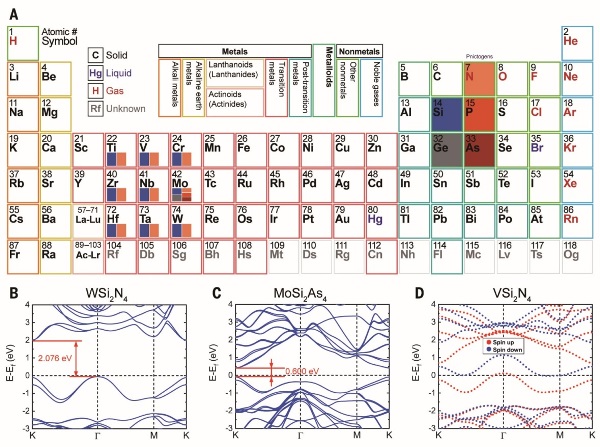 在此基礎(chǔ)上,他們與金屬所陳星秋研究組和孫東明研究組合作,發(fā)現(xiàn)單層MoSi2N4具有半導(dǎo)體性質(zhì)(帶隙約1.94 eV)和優(yōu)于MoS2的理論載流子遷移率,還表現(xiàn)出優(yōu)于MoS2等單層半導(dǎo)體材料的力學(xué)強(qiáng)度和穩(wěn)定性;并通過理論計(jì)算預(yù)測(cè)出了十多種與單層MoSi2N4具有相同結(jié)構(gòu)的二維層狀材料,包含不同帶隙的半導(dǎo)體、金屬和磁性半金屬等。