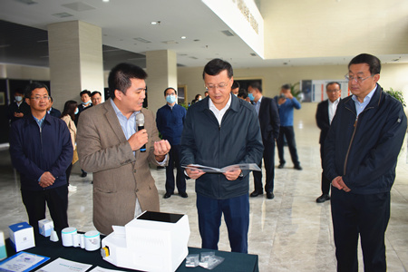楊軍一行聽取了微生物制造工程中心呂雪峰研究員有關(guān)螺旋藻生產(chǎn)甘油葡糖苷技術(shù)和微生物發(fā)酵制備反式烏頭酸技術(shù)的產(chǎn)業(yè)化應(yīng)用成果、單細(xì)胞中心徐健研究員有關(guān)團(tuán)隊研發(fā)的國際上首臺高通量流式拉曼分選儀及掌上型新冠病毒快檢儀的匯報,深入了解了科研產(chǎn)品與實驗裝置。