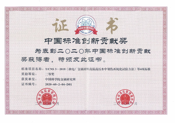 10月14日,在世界標(biāo)準(zhǔn)日當(dāng)天,市場監(jiān)管總局(標(biāo)準(zhǔn)委)正式發(fā)布了《關(guān)于2020年度中國標(biāo)準(zhǔn)創(chuàng)新貢獻(xiàn)獎授獎的決定》,揭曉了2020年中國標(biāo)準(zhǔn)創(chuàng)新貢獻(xiàn)獎表彰名單。金屬所中科院核用材料與安全評價重點實驗室牽頭編制的《核電廠金屬材料高溫高壓水中劃傷再鈍化試驗方法》(T/CNS 3—2018)等4項中國核學(xué)會團(tuán)體標(biāo)準(zhǔn)榮獲標(biāo)準(zhǔn)項目獎二等獎。