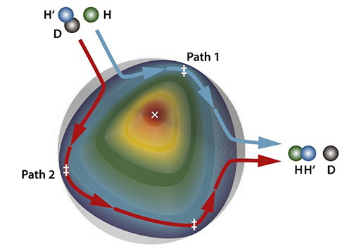 化學(xué)反應(yīng)的進(jìn)程伴隨著復(fù)雜的量子力學(xué)現(xiàn)象,但其通常難以被直接觀測(cè)到,因而化學(xué)反應(yīng)的本質(zhì)亦難以得到透徹的理解。大連化物所院士楊學(xué)明、院士張東輝、研究員孫志剛和研究員肖春雷團(tuán)隊(duì)提供了一個(gè)研究范例。他們研究發(fā)現(xiàn),在H+HD H2+D反應(yīng)中,在碰撞能量為1.9~2.2電子伏的范圍內(nèi),產(chǎn)物H2(v’=2,j’=3)的后向散射呈現(xiàn)顯著的振蕩(其中v’是振動(dòng)量子數(shù),j’是轉(zhuǎn)動(dòng)量子數(shù))。通過拓?fù)淅碚摲治?,他們發(fā)現(xiàn)該反應(yīng)存在兩條迥然不同的反應(yīng)路徑,振蕩是由這兩條路徑之間的量子力學(xué)干涉所產(chǎn)生的。該研究揭示了該反應(yīng)在較低能量處,量子幾何相位效應(yīng)仍然存在,并可以被觀測(cè)到。這非常類似于眾所周知的Aharonov-Bohm效應(yīng),清晰地揭示了化學(xué)反應(yīng)的量子性。