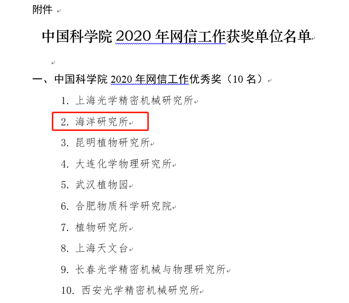 近日,中科院辦公廳發(fā)布2020年中國科學(xué)院信息化評(píng)估結(jié)果,海洋研究所位列第2名,榮獲網(wǎng)信工作優(yōu)秀獎(jiǎng)。