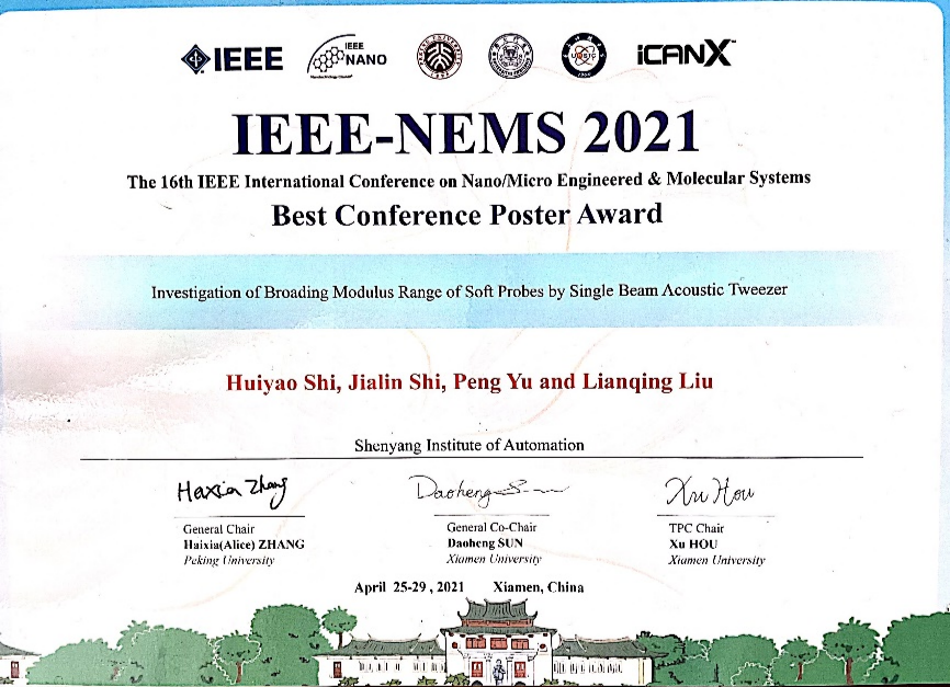 近日,第16屆微納工程與分子系統(tǒng)國際研討會(the 16th IEEE International Conference on Nano/Micro Engineered & Molecular Systems:IEEE-NEMS2021)國際會議在廈門舉行。中國科學(xué)院沈陽自動化研究所博士生石慧瑤等撰寫的論文Investigation of Broading Modulus Range of Soft Probes by Single Beam Acoustic Tweezer脫穎而出,獲得最佳會議海報獎。