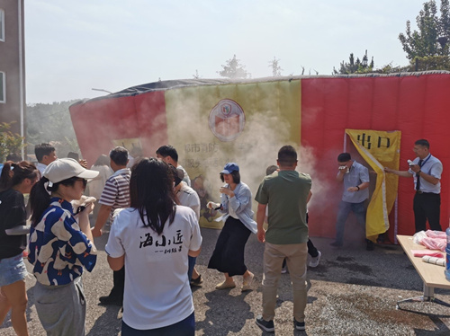 演練則設(shè)置了模擬火災(zāi)逃生屋,布置場(chǎng)景、散布煙霧,模擬出逼真的火災(zāi)現(xiàn)場(chǎng)。在沒(méi)有照明、濃煙密布的情況下,參加演練人員濕毛巾捂住口鼻、低下身體,按照安全逃生要領(lǐng)“逃”出火災(zāi)現(xiàn)場(chǎng),體驗(yàn)火災(zāi)發(fā)生后如何在狹小黑暗的空間里疏散逃生和實(shí)施自救。