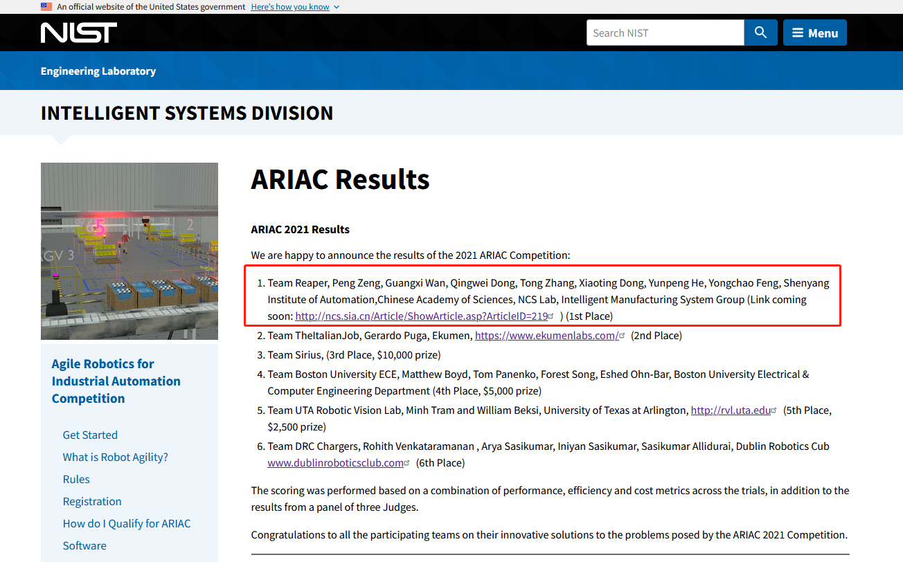 7月15日,由美國國家標準與技術(shù)研究院(NIST)舉辦的2021年度ARIAC(Agile Robotics for Industrial Automation Competition)面向工業(yè)自動化的敏捷機器人集群國際挑戰(zhàn)賽發(fā)布了比賽結(jié)果,經(jīng)過初賽、決賽二輪激烈角逐,中國科學院沈陽自動化研究所工業(yè)控制網(wǎng)絡(luò)與系統(tǒng)研究室邊緣計算與邊緣智能課題組萬廣喜、董青衛(wèi)、張通、董曉婷、賀云鵬、馮勇超組成的Reaper團隊,在參賽的60余支代表隊中脫穎而出,榮獲冠軍。 Ekumen實驗室的TIJob團隊、Denbar Robotics機器人研究中心Sirius團隊、波士頓大學ECE團隊、德克薩斯大學UTA Robotic Vision Lab團隊和Dublin機器人俱樂部DRC Chargers團隊分獲2-6名。
