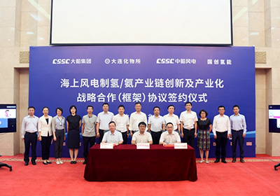 8月6日,中國科學(xué)院大連化學(xué)物理研究所與大連船舶重工集團有限公司(以下簡稱“大船集團”)、中國船舶集團風(fēng)電發(fā)展有限公司(以下簡稱“中船風(fēng)電”)、國創(chuàng)氫能科技有限公司(以下簡稱“國創(chuàng)氫能”)在大船集團簽訂了《海上風(fēng)電制氫/氨產(chǎn)業(yè)鏈創(chuàng)新及產(chǎn)業(yè)化戰(zhàn)略合作(框架)協(xié)議》。大船集團黨委書記、董事長楊志忠與副總經(jīng)理、總工程師鄭煒,中船風(fēng)電副總經(jīng)理張曉陽,國創(chuàng)氫能總經(jīng)理辛廷慧及各企業(yè)相關(guān)人員,大連市發(fā)改委工業(yè)處處長萬九文,大連市科技局副局長蔣行海,大連市氫能產(chǎn)業(yè)發(fā)展促進協(xié)會會長任峰等,大連化物所副所長李先鋒、科研及職能部門相關(guān)人員以線下或線上形式參加簽約儀式。簽約儀式由大船集團高級顧問牛淑鴻主持。