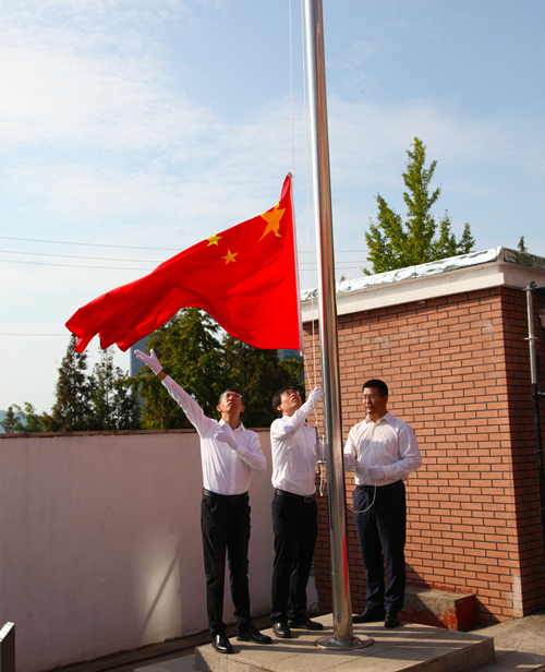 上午八點半,升旗儀式正式開始,升旗手邁著整齊有力的步伐,護送著國旗步入升旗儀式現場。伴隨著雄壯的國歌聲,五星紅旗冉冉升起,全體人員莊嚴肅穆,向國旗行注目禮,高唱中華人民共和國國歌。