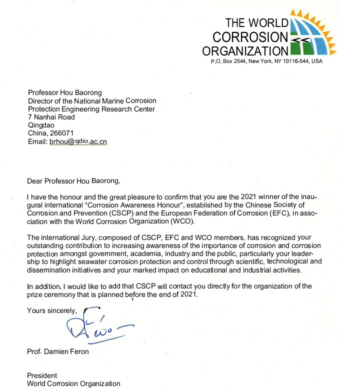 世界“腐蝕成就獎(jiǎng)”獲獎(jiǎng)通知