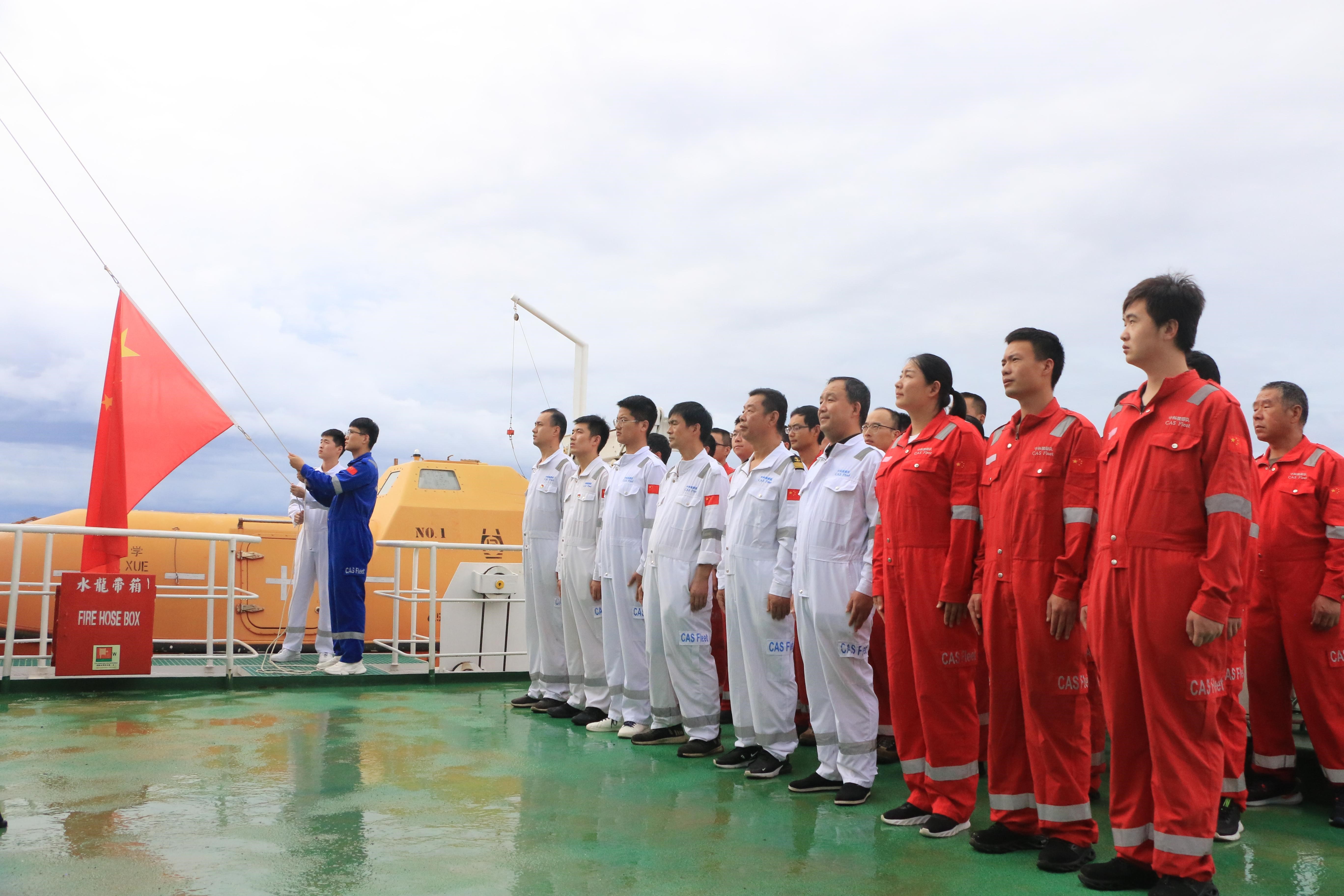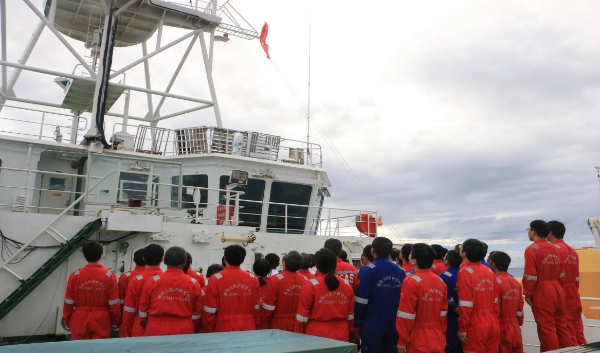 懷著對(duì)祖國(guó)母親的真摯祝福,“科學(xué)”號(hào)全體船隊(duì)員統(tǒng)一著裝,黨員佩戴黨徽,列隊(duì)甲板,懷著激動(dòng)的心情舉行升國(guó)旗儀式,慶祝中華人民共和國(guó)72周年華誕。船長(zhǎng)孫其軍和政委劉兵莊重地將國(guó)旗交到升旗手手中,伴隨著雄壯的國(guó)歌聲,鮮艷的五星紅旗在“科學(xué)”號(hào)上緩緩升起,在熱帶西太平洋海域迎風(fēng)飄揚(yáng)。