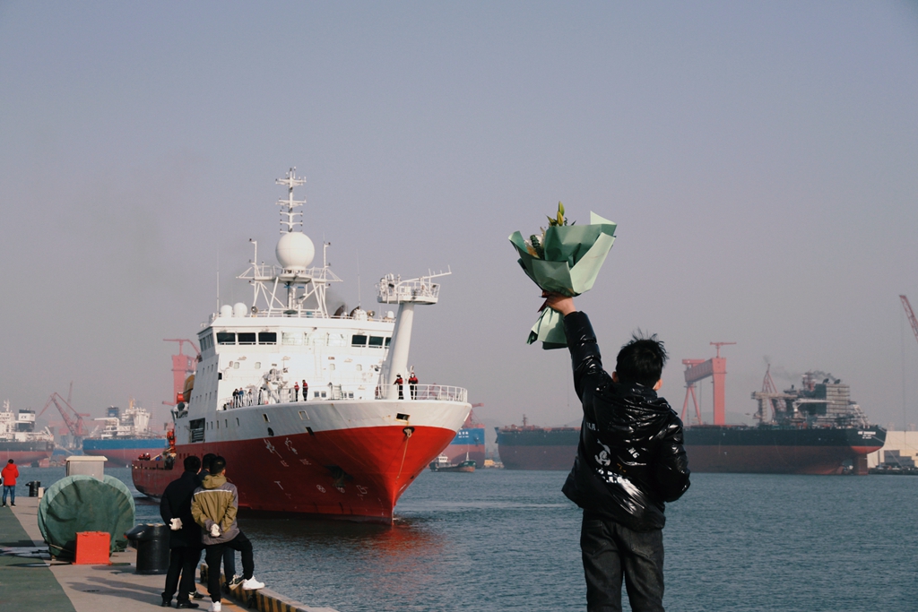 2021年1月12日,出海已近三個(gè)月的“科學(xué)”號(hào)科考船返航,科研人員上小學(xué)的兒子興奮地在碼頭迎接爸爸回家。(中國(guó)科學(xué)院海洋研究所 苑林 攝)