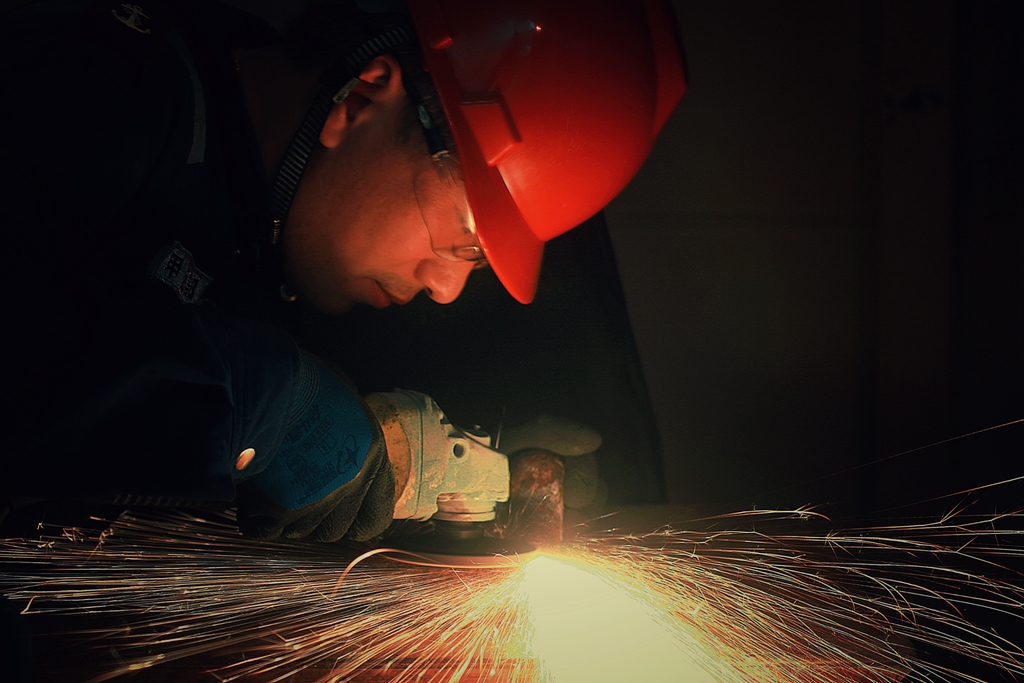 2021年6月15日,“科學(xué)”號(hào)科考船工作間,技術(shù)人員在修理CTD導(dǎo)向滑輪。(中國(guó)科學(xué)院海洋研究所 苑林 攝)