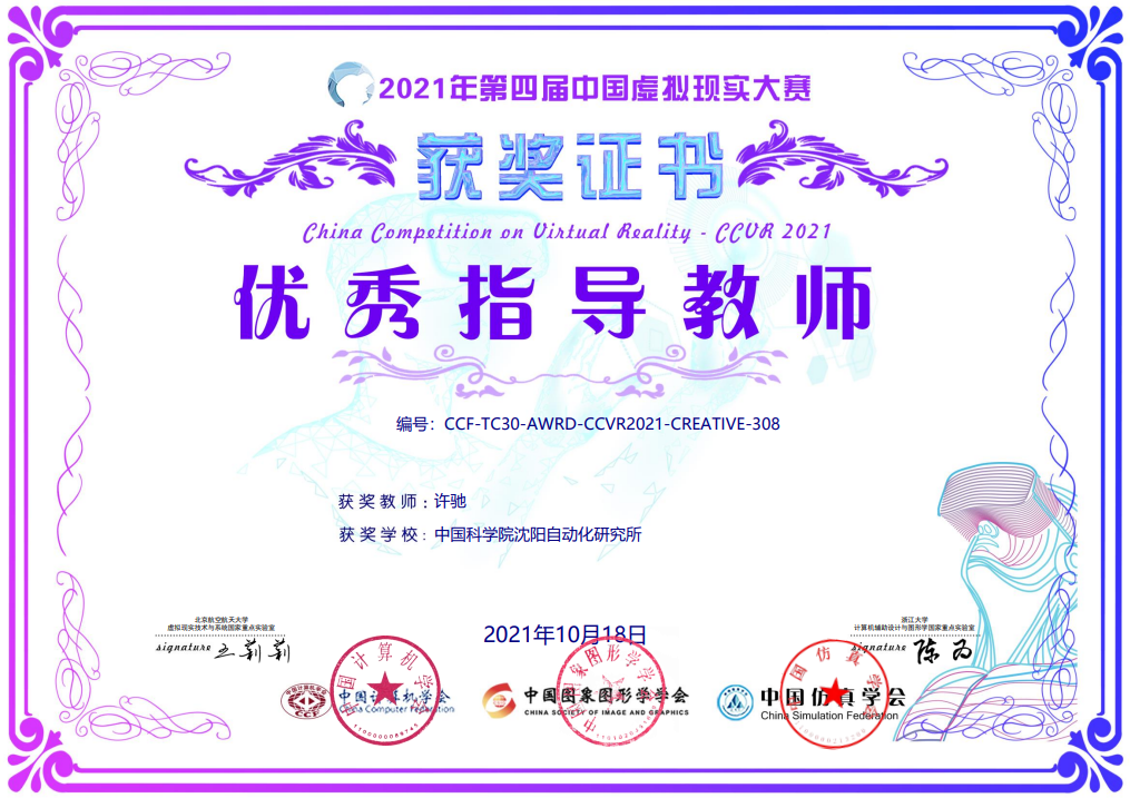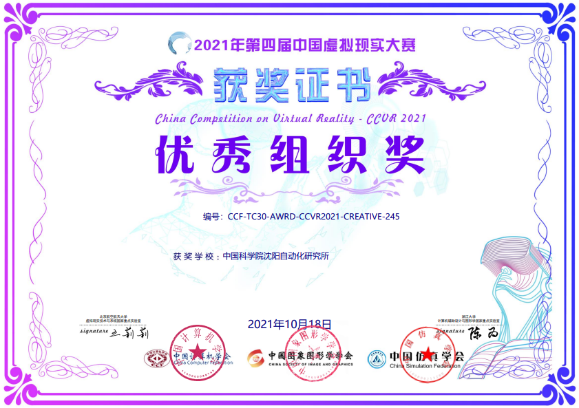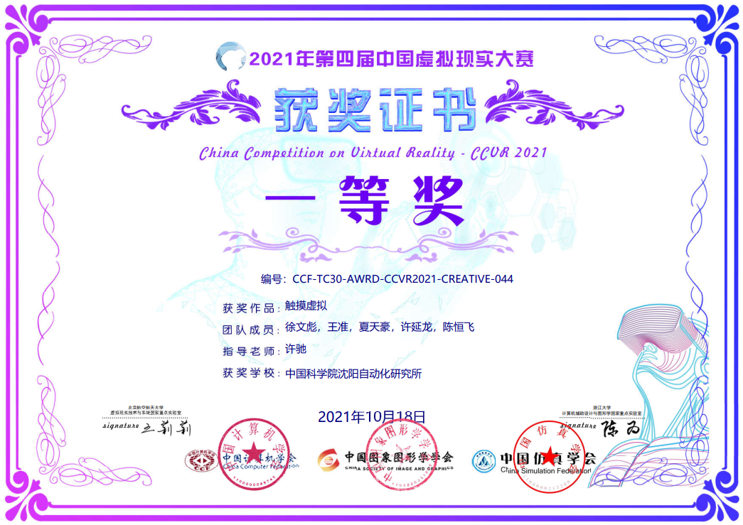 10月17日-18日,第四屆中國虛擬現(xiàn)實大賽決賽在中國南昌舉行,中國科學院沈陽自動化研究所工業(yè)控制網(wǎng)絡(luò)與系統(tǒng)研究室組成的SIA_Touchable團隊經(jīng)過初賽、決賽等多個環(huán)節(jié)在應用類智能互動賽道中脫穎而出,獲大賽一等獎,沈陽自動化所獲得優(yōu)秀組織獎,許馳副研究員獲優(yōu)秀指導教師。