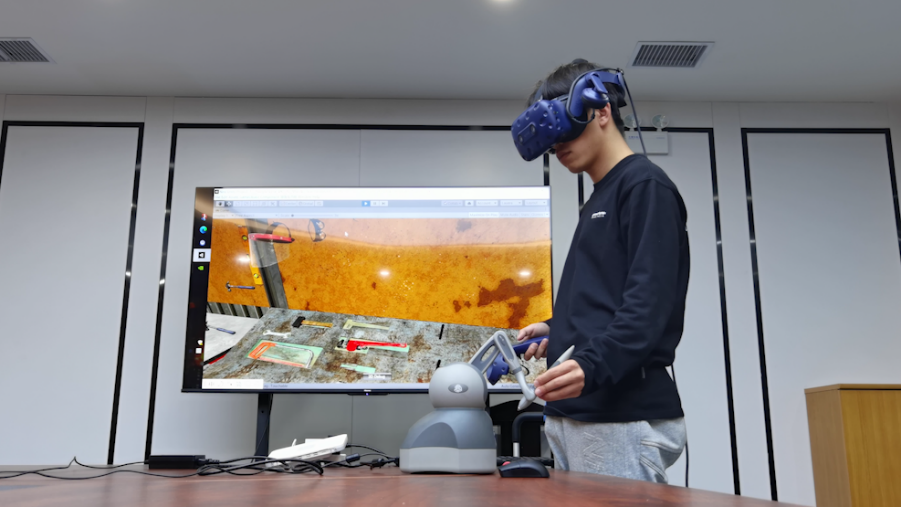 沈陽自動化所SIA_Touchable參賽團隊基于VR頭顯、Touch觸感終端等設(shè)備,以Unity為引擎,搭建了集成“視觸聽”多維立體化感知的VR無線系統(tǒng)。作品在虛擬世界中,真實還原了沈陽自動化所的原貌,設(shè)計了虛擬的智能工廠,可以支持6DOF的全視角VR體驗,提供摩擦力、重力、粘性力、彈簧力、震動等5種力觸覺感知,提供40余個工具零部件和設(shè)備的虛擬操控。通過與5G技術(shù)結(jié)合,可為工程師提供視覺、聽覺之外的觸覺感知,獲得更高的沉浸感,支持工程師的設(shè)備檢修、維護、觸感遙操作等創(chuàng)新應用。