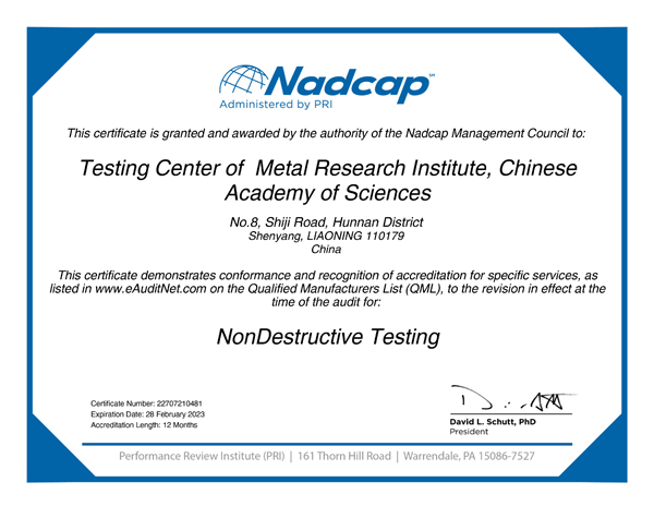 11月,金屬所分析測試中心順利通過由三方獨立審查協(xié)會PRI(Performance Review Institute)組織的Nadcap體系審核,并正式獲得PRI頒發(fā)的Nadcap-NDT(無損檢測)證書。