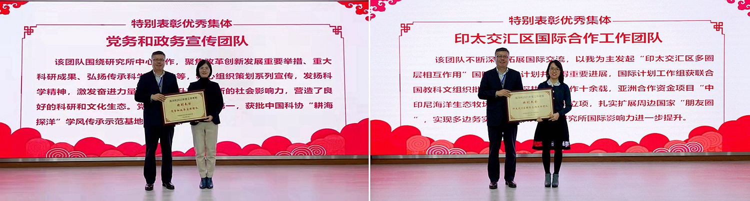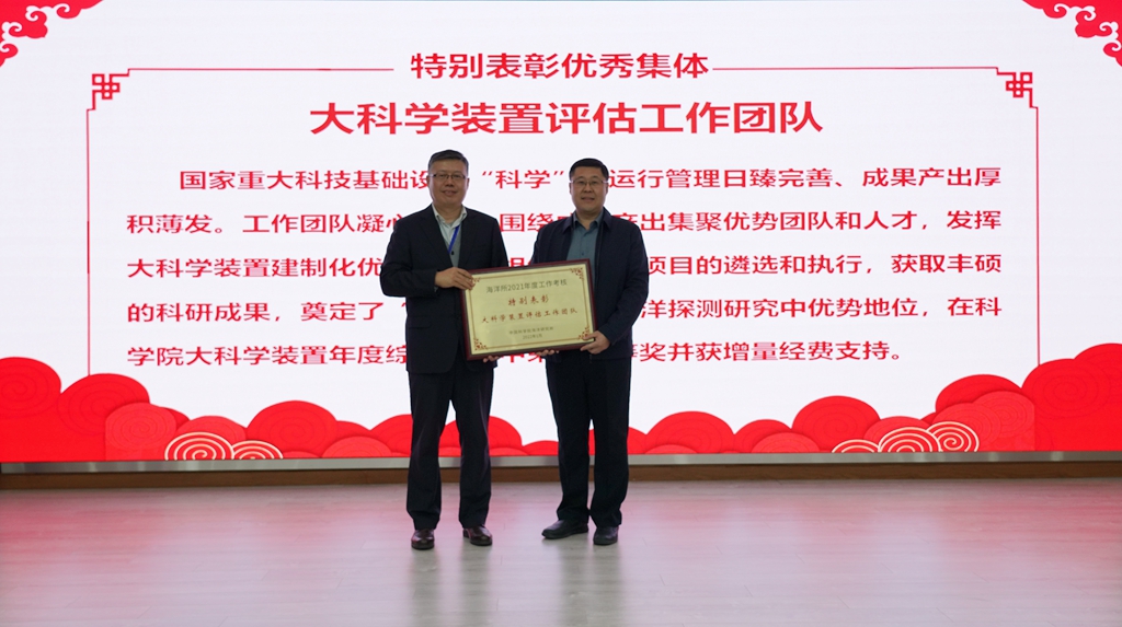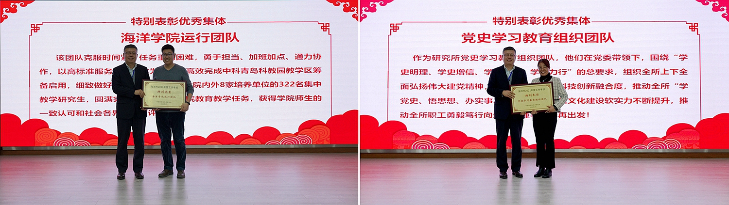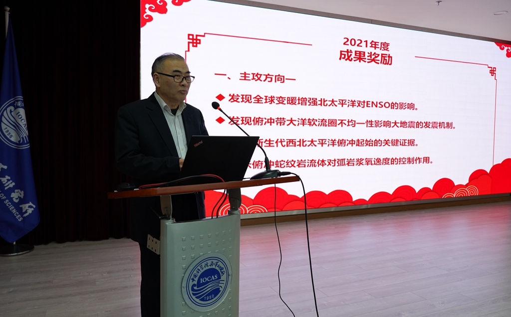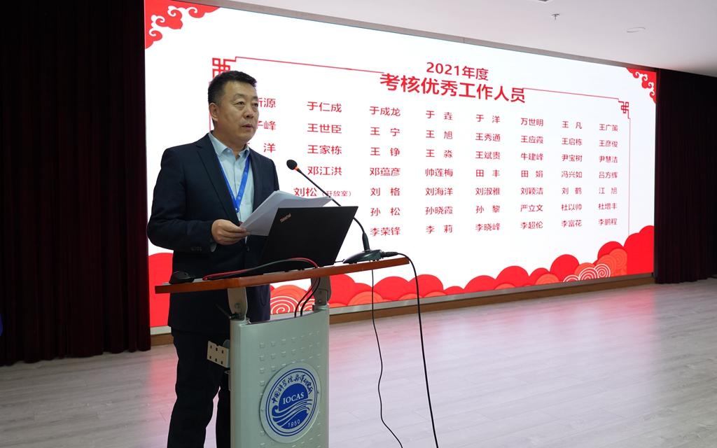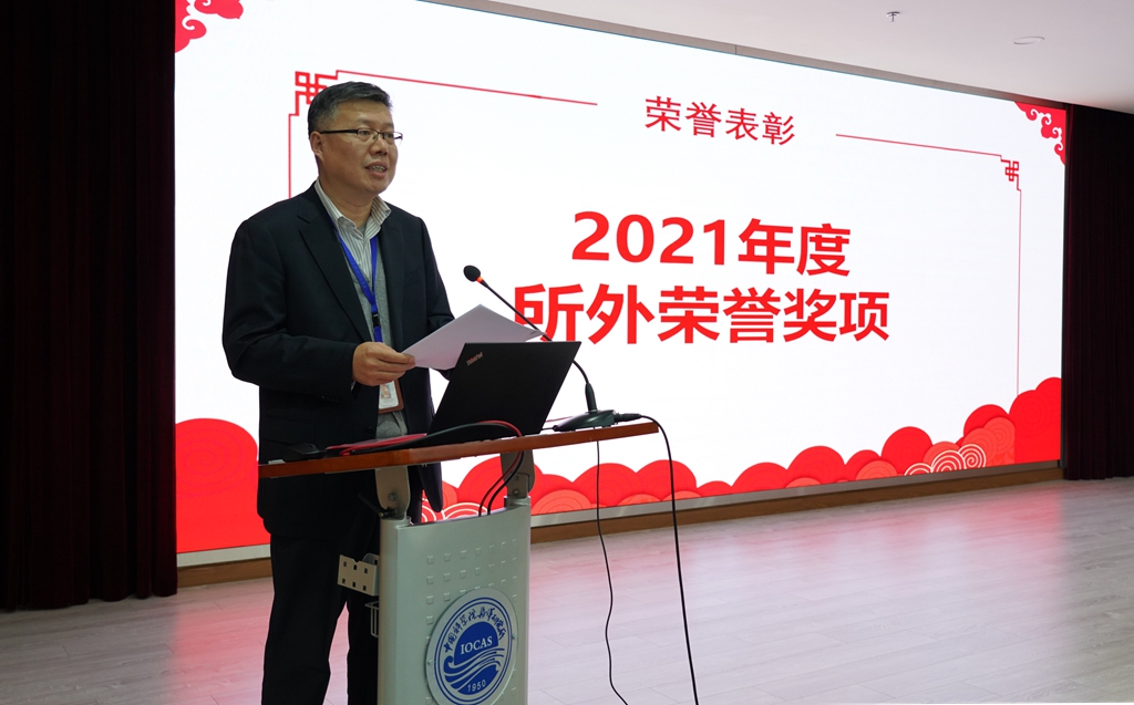 會議宣讀了研究所2021年度成果、獲得所外各類榮譽獎項以及年度考核優(yōu)秀研究組、優(yōu)秀集體和個人的通知,對獲獎集體和個人進行了表彰,并公布了海洋所2021年度十件大事評選結果。