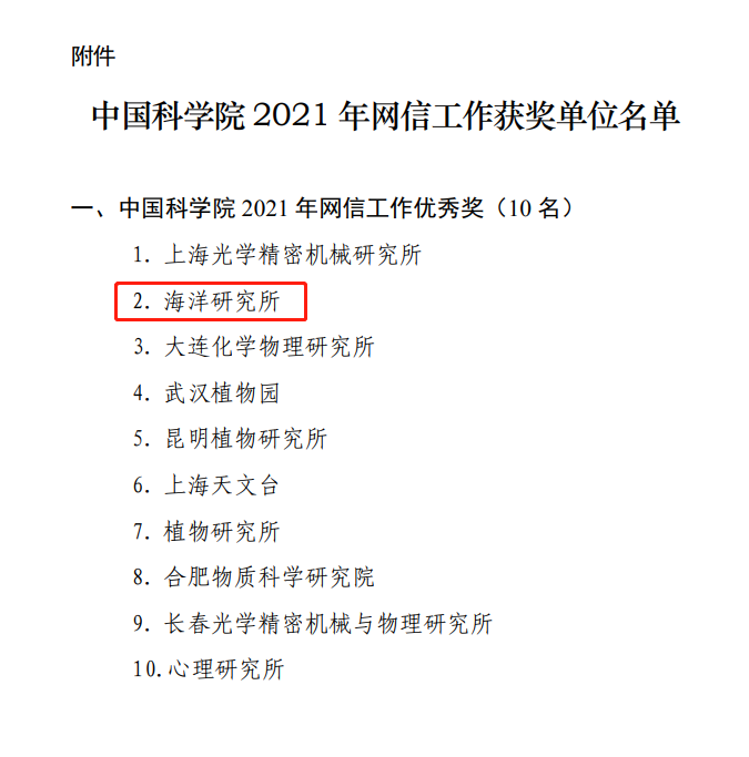 近日,中國科學(xué)院2021年信息化評估結(jié)果出爐,海洋所以全院第2名的優(yōu)異成績榮獲中國科學(xué)院2021年網(wǎng)信工作優(yōu)秀獎(全院共10家單位入選)。這是自2014年以來,海洋所第7次獲評該獎項。