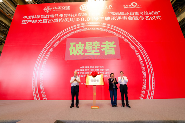 在中國科學(xué)院戰(zhàn)略性先導(dǎo)科技專項(xiàng)“高端軸承自主可控制造”支持下,由中國科學(xué)院金屬研究所牽頭,聯(lián)合中國交通建設(shè)集團(tuán)有限公司的中交天和機(jī)械設(shè)備制造有限公司、洛陽新強(qiáng)聯(lián)回轉(zhuǎn)支承股份有限公司等國內(nèi)二十余家優(yōu)勢(shì)單位,研制的直徑8.01米主軸承近日在江蘇常熟通過專家組評(píng)審,并被正式命名為“破壁者”。中國科學(xué)院重大任務(wù)局何京東處長(zhǎng)、綜合規(guī)劃局白雪瑞副處長(zhǎng),金屬所李依依院士、陳星秋副所長(zhǎng)、科技處黃糧處長(zhǎng)、專項(xiàng)首席專家李殿中研究員、技術(shù)總師胡小強(qiáng)研究員等相關(guān)領(lǐng)導(dǎo)和科研人員出席評(píng)審會(huì)暨命名儀式。