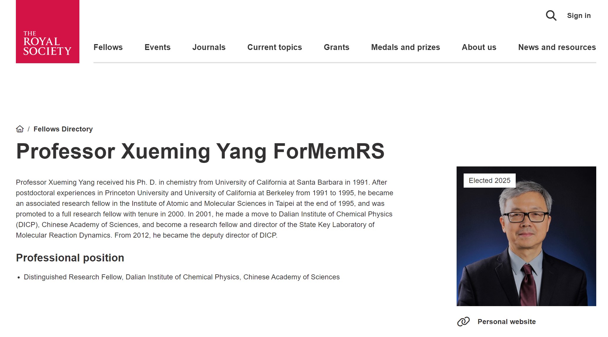 5月20日,英國皇家學(xué)會(The Royal Society)官方網(wǎng)站公布了2025年度新增選的70位院士、1位榮譽院士和24位外籍院士名單。大連化物所楊學(xué)明院士當(dāng)選英國皇家學(xué)會外籍院士(Foreign Membership)。