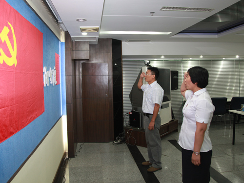 在周峰的帶領(lǐng)下,新發(fā)展的預備黨員王芳在黨旗下莊嚴宣誓。